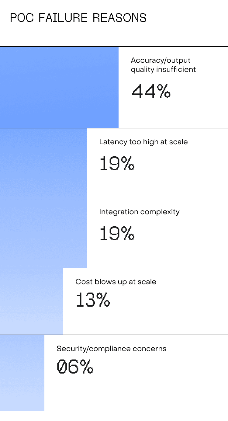 The accuracy problem deserves emphasis. It’s not that models can’t do the task. It’s that they can’t do it reliably enough for production. The jump from an 80% accurate demo to a 95% reliable production system is where most engineering effort and cost concentrates, and where most POCs stall.