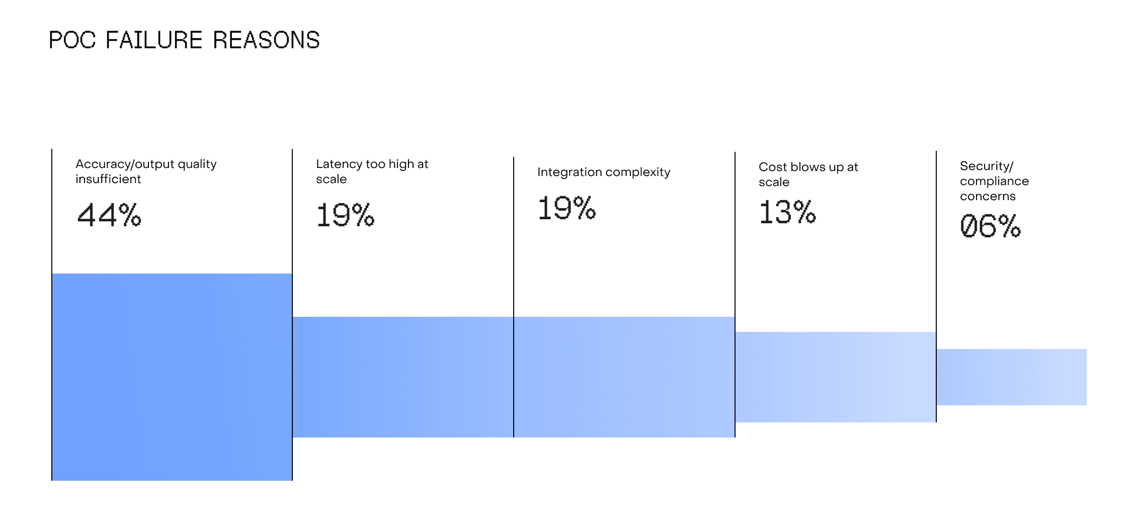 Among CTOs who’ve seen POCs fail (N=16): accuracy and output quality are the biggest culprits. They kill 44% of POCs. Latency at scale (19%) and integration complexity (19%) are tied for second.